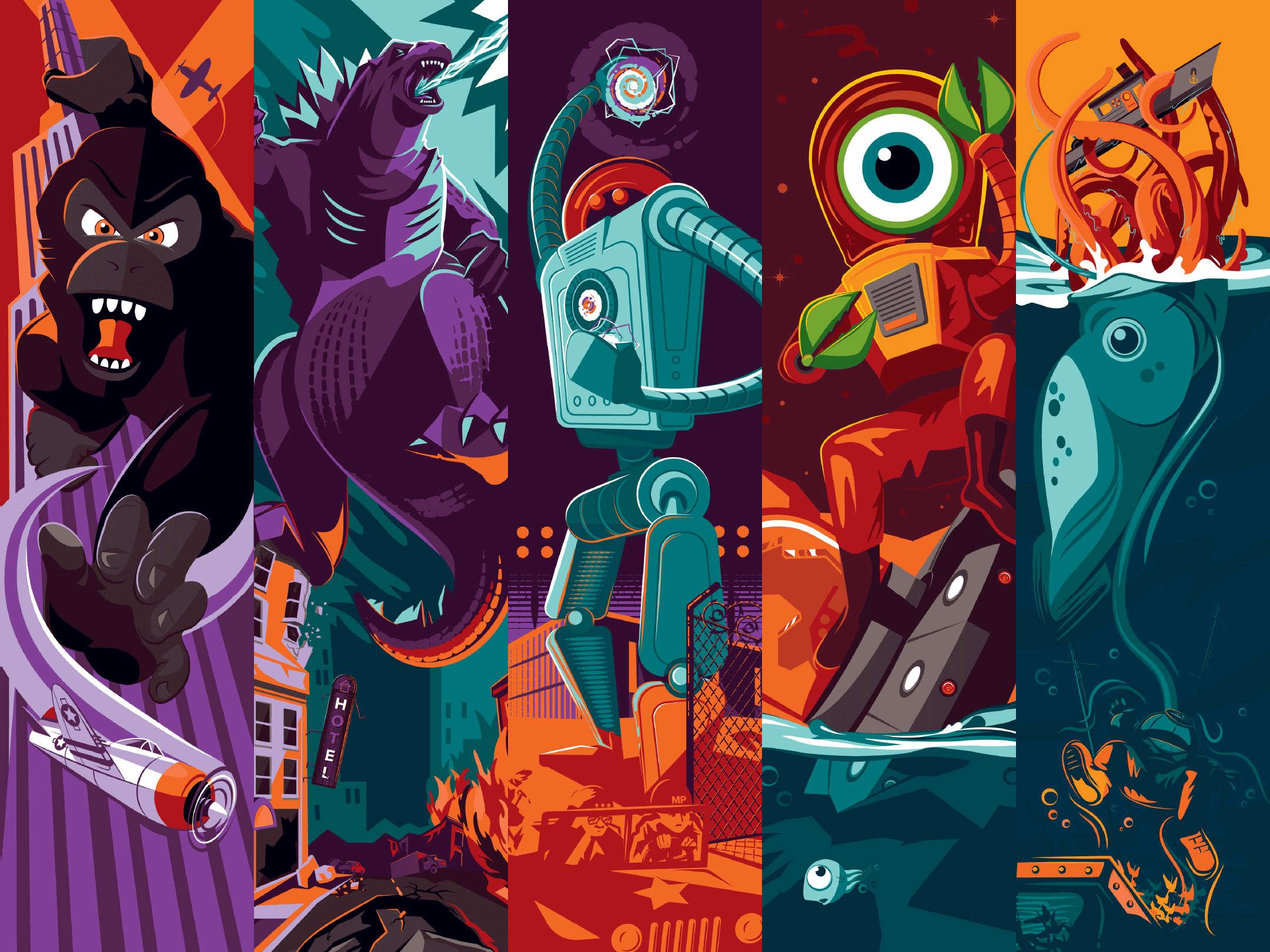 When the design agency I work for was planning the renovation of our new garage space, I was presented with a question: “If you were going to put a wall mural in here, where would you put it?” I couldn’t resist the idea of using the mezzanine as a divider for an interchangeable alien, robot, monster mural. I started with a quick sketch mockup of my idea to demonstrate how it would work.